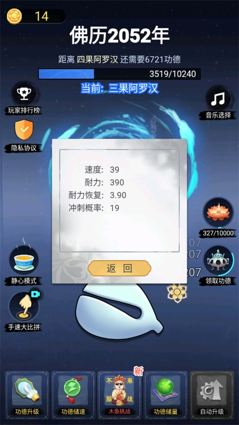 游戏中的原有角色被赋予了四项属性:木鱼敲击速度、耐力、耐力恢复速率与冲刺概率,这些属性数值会随角色等级提升而增长。进入挑战界面后,玩家需点击屏幕操控我方角色(对应主界面角色)敲击木鱼积累功德值,在此过程中要与挑战对象比拼,率先达成当前关卡的功德目标(每个挑战对象的目标各不相同),获胜即可解锁下一位挑战对象。