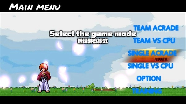 打开游戏后,轻触屏幕就能进入主界面。界面上总共有六个选项,初始显示为英文,你可以通过点击选项来切换成中文说明。其中,前两个“TEAM”选项和后两个“SINGLE”选项的主要差异在于:选择“TEAM”时,需要玩家挑选3名不同的角色,并且可以自主调整他们的出场顺序;而“SINGLE”则只需选择一个角色即可。现在,我们点击第三个单人闯关模式,接着再次点击以确认选择。