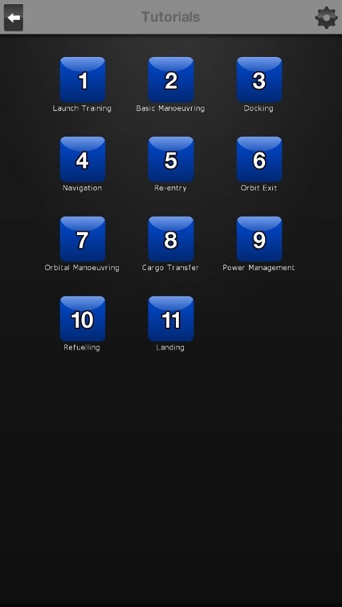 打开教程后,需按顺序依次进行发射训练、基本操作、停靠码头、航行、重返、轨道出口、轨道手动、货物转运、电源管理、加油和着陆这些项目。