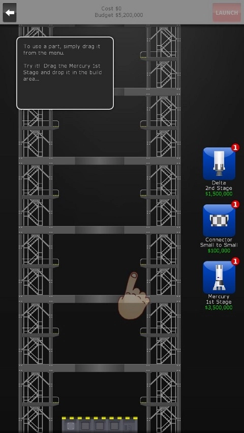 在教程1里,我们能够知晓火箭建造的具体操作流程。在建筑界面中,顶部显示着费用的具体数值,玩家需要在有限的预算范围内完成火箭的建造工作。第一步是挑选火箭的主体部分,详情见图:
