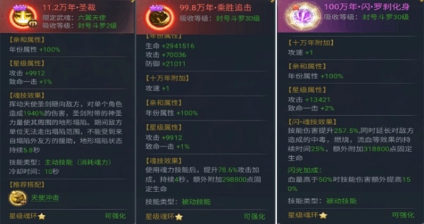 副天使核心魂环配置为:万阳凌天、神魂不灭、圣裁、天使神威、乘胜追击与罗刹化身。