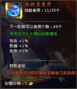 坐骑能够喂食资质丹,而资质丹可以按照百分比提升坐骑的进阶属性。