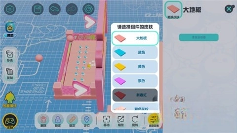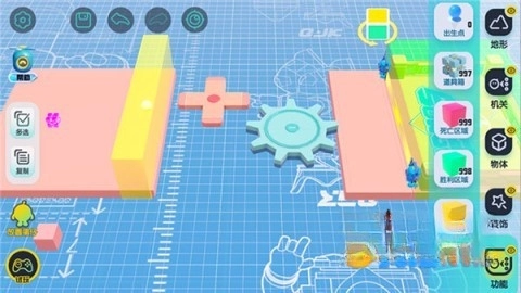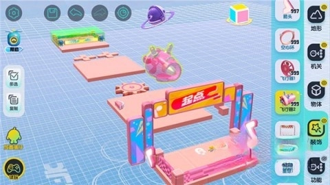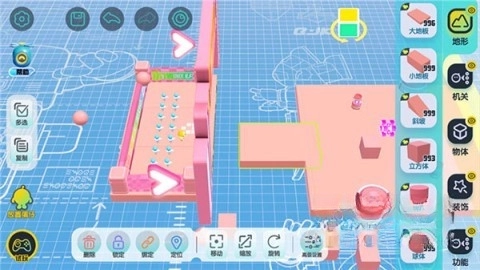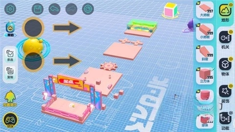 【地形组件】是关卡的基础构成部分,玩家只需用单指拖拽就能把它放置到场景里。被选中的组件能够进行移动、缩放或是旋转操作。场景的左侧设有复制按钮,有助于玩家快速复制组件。