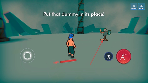 当遇到假人这类目标时,先靠近目标,然后点击攻击按钮,按照提示“Put that dummy in its place!”对目标展开击打。