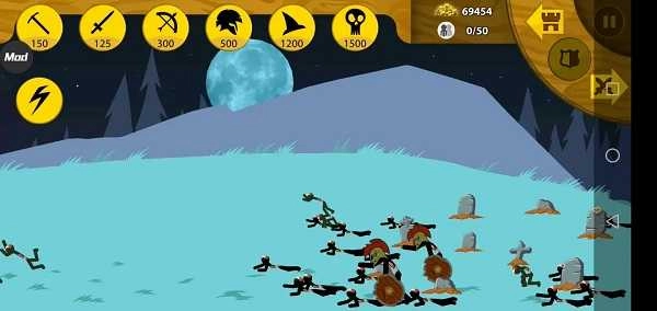 屏幕右上角设有三个按钮,其中向左的箭头按钮被点击后,所有火柴人都会退守至基地后方。当敌人发起攻击时,仅弓箭手能够对敌人进行攻击,但这也会导致我们的基地出现损耗。