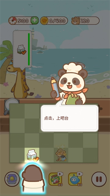 1, 目前在本站的游戏里,启动游戏后能看到顾客需要牛奶和水。点击下方的厨师会制作出一杯水,把两杯水合成就能得到牛奶,合成好的牛奶放入上方的机器里就能完成出餐。