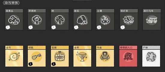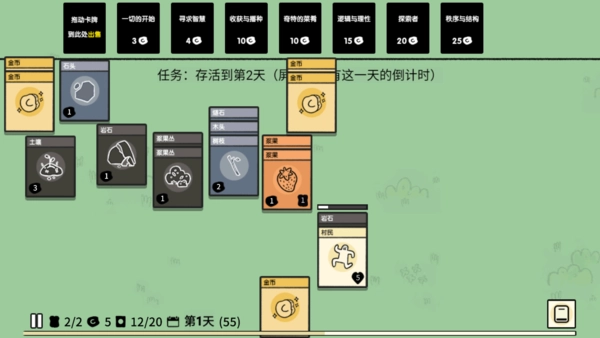 游戏里总共有114张卡牌,它们被划分成人与地点(12张)、生物(12张)、食物(16张)、建筑(16张)、资源(14张)这些类别。所有卡牌都能通过出售来获取金币,金币则可以用来抽取不同类型的卡包,像基础资源包(包含钥匙和泥土)、灵感包(内含合成指南)、探索包(涵盖地图区域,比如森林、平原、古村)等等。