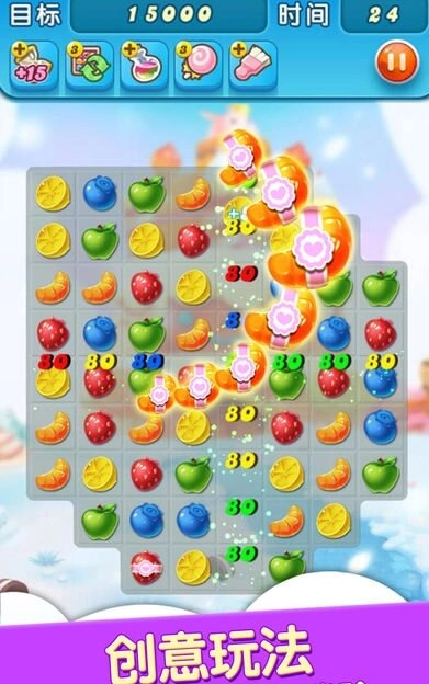 通过滑动连接三个或三个以上相同的水果来实现消除,巧妙规划滑动路径,以达成关卡设定的目标分数或满足特殊要求。