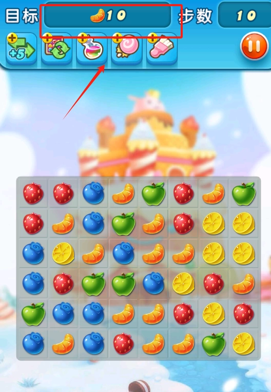 消除水果以达成10分的目标,在步数耗尽前完成任务,也可以使用道具增加5步来辅助通关。