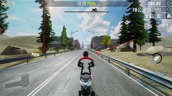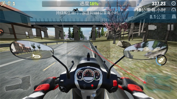 操控摩托车时,要持续按住油门键来加速,目标是把速度提高到每小时100公里,以此推进关卡的进度。