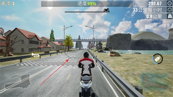 当进度接近终点的99%时,请保持当前的行驶轨迹,径直冲过终点线,即可完成本关卡。