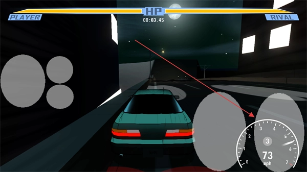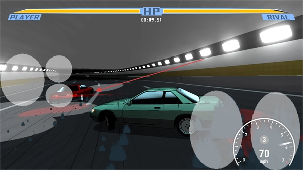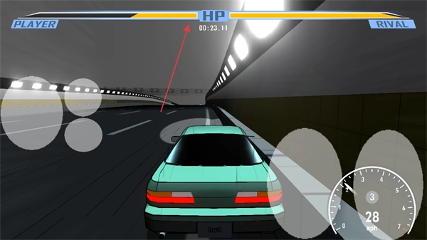 调整右侧的仪表来提升车速,比如达到73mph,在隧道内保持行驶状态,同时紧盯对手的车辆。