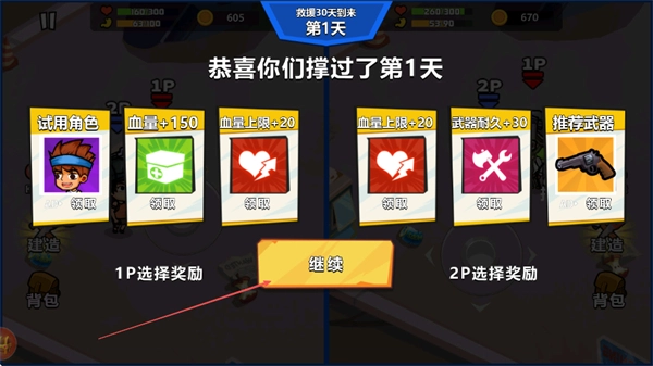 成功度过一天后,你可以挑选诸如生命值提升、武器耐用度增加之类的奖励,点击继续就能开启新的一天,坚持活下去,完成“撑过30天”的挑战。