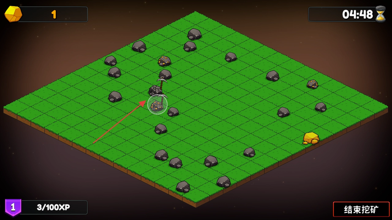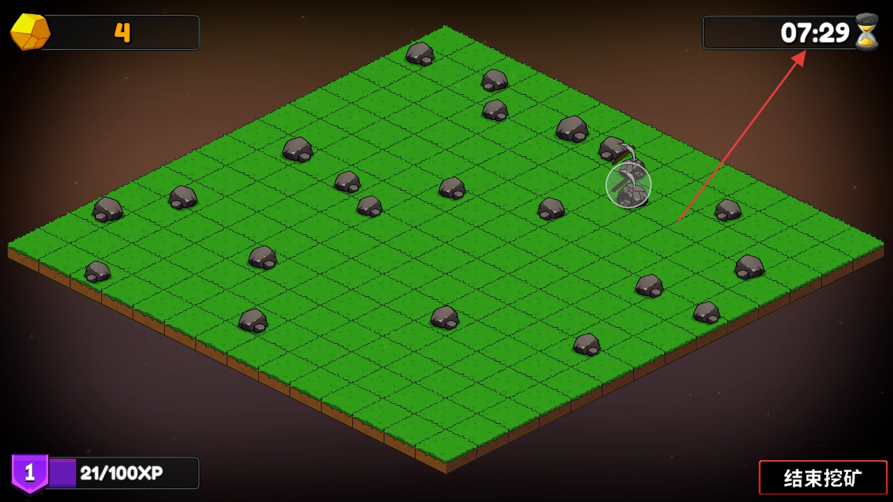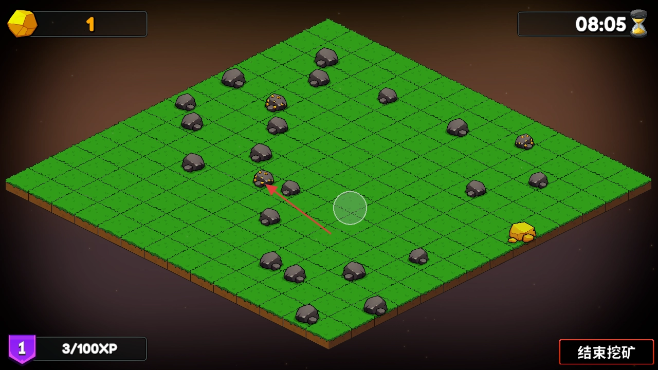 进入游戏后,左上角的数字1代表当前拥有的矿石数量,同时要注意右上角的倒计时(例如显示为08:05),需在规定时间内完成挖掘操作。