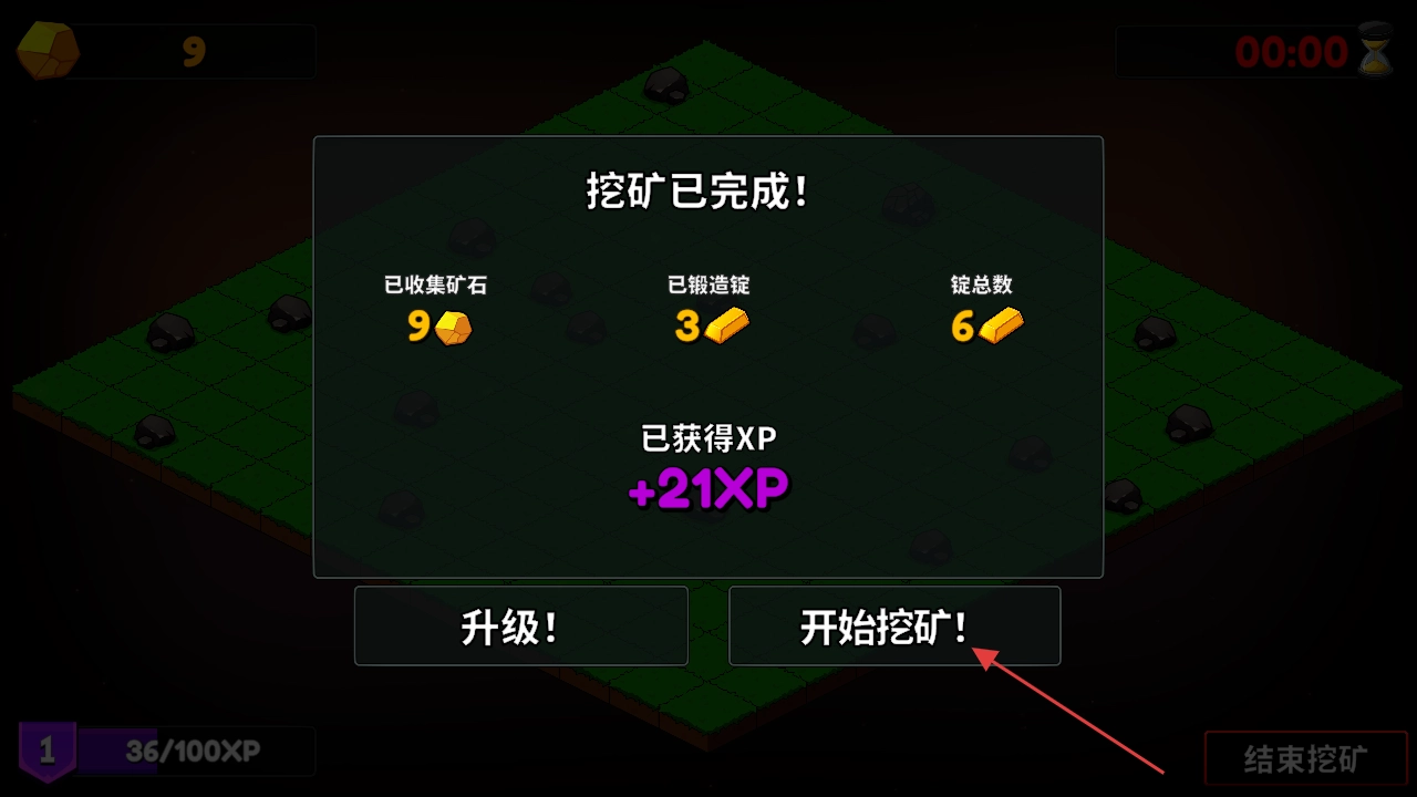 时间结束后,查看挖矿完成结算界面的信息,点击“开始挖矿”按钮,重新启动新一轮的挖掘流程。