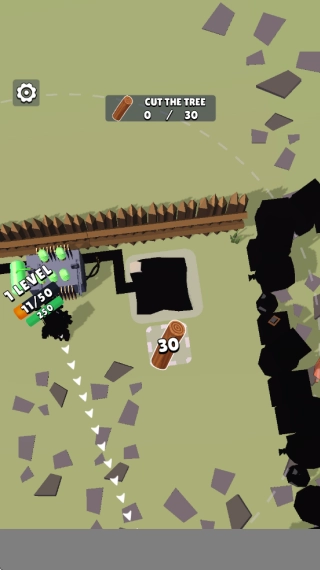 玩家能够依据画面顶部的任务指引开展操作,此刻去砍伐树木收集三十根木材来制作武器道具吧。