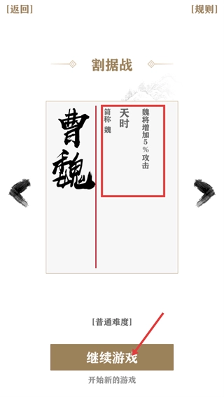 在【割据战】玩法里,选择【曹魏】阵营将获得【天时】增益效果——魏将的攻击力提升5%,此对局设定为【普通难度】,点击【继续游戏】按钮就能开启这场对战。
