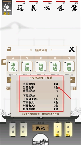 【招募武将】界面会呈现当前等级减1级的数值、当前拥有的5金币数量;每消耗1金币能够增加1点经验,等级提升后下一级可上阵的武将数量为3人,并且下次出战时可额外获得1点经验。