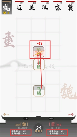 在对战过程中,我方【华佗】受到了63点伤害,我方剩余兵力减少195,本局血量降低100,敌方董卓的剩余兵力则为93。目前正依靠已部署的武将推动战局发展。