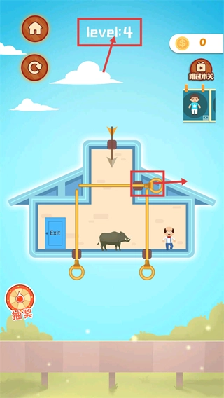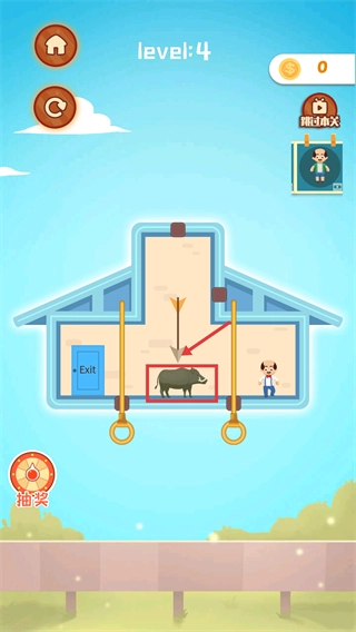 触发顶部机关后,让落物精准困住目标动物,这是推进【level:4】关卡的关键步骤。