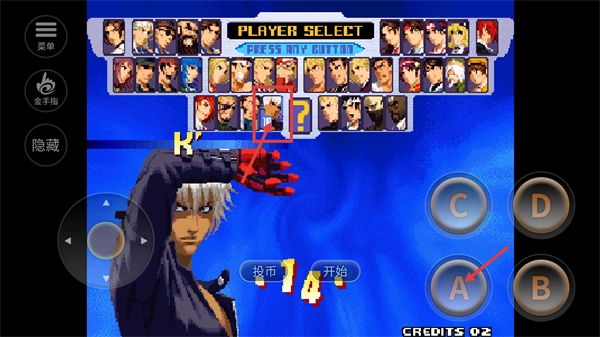 进入【PLAYER-SELECT】界面后,首先选择像【K'】这样的核心角色,接着搭配援护角色,最后按下【开始】键确认所选阵容。