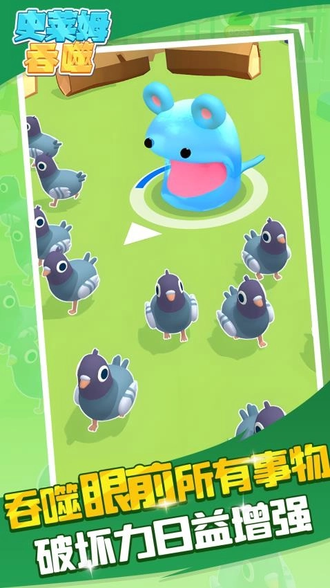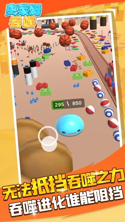 用手指在屏幕上滑动,指引史莱姆移动,让它吞噬比自己体型小的物体。