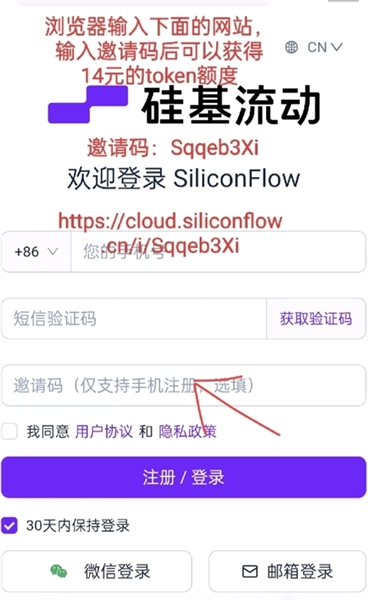 4、在浏览器地址栏输入https://cloud.siliconflow.cn/i/Sqqeb3Xi 后进行账号登录操作,并填写邀请码Sqqeb3Xi。