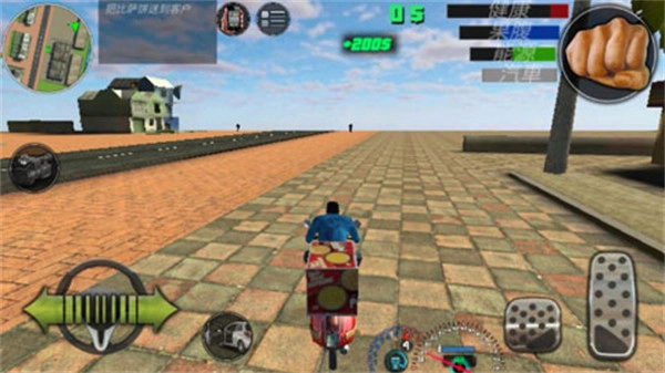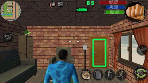 1、左侧遥感是控制角色移动,而右侧按钮执行攻击跳跃等动作,点击车门标志驾驶车辆,摄像机切换人称视角;