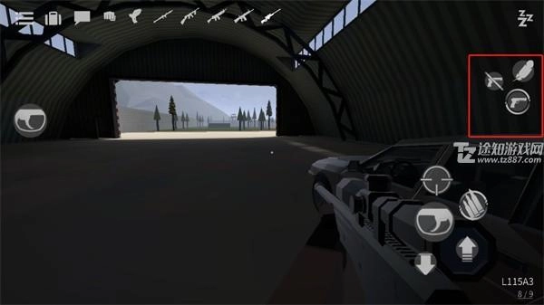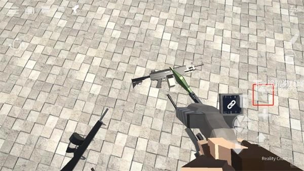 1、想要拿枪就必须先找到一把枪,找到枪后需要将准心放到枪上,这时屏幕左边会出现一个手指按钮,按住手指按钮即可拾取;