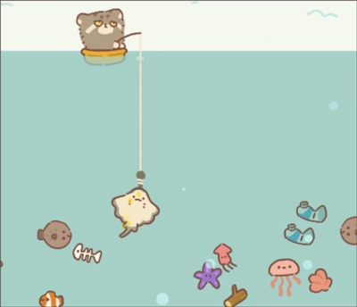 鱼塘里有18样相关物品:其中鱼骨、易拉罐、塑料瓶这几样属于垃圾;树枝、小丑鱼、比目鱼、水母、鱿鱼、螃蟹、粉色贝壳、海星、红河豚、鲨鱼这些比较容易钓上来;海马、墨鱼、海胆、金鱼的出现没有固定规律,每天可能随机出现其中一种,也可能都不出现;蝴蝶鱼出现的时候,池塘的水面会泛起布灵布灵的光,就像福袋那样闪闪发光。