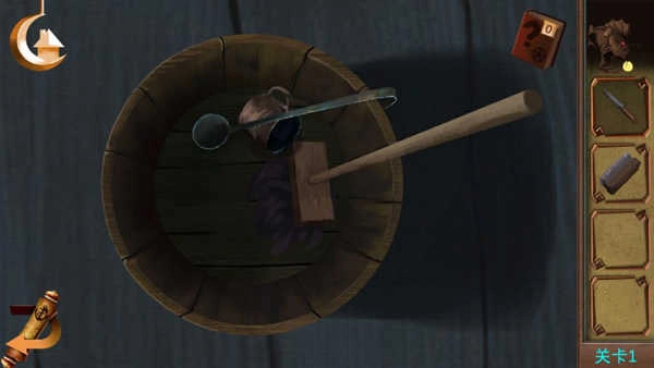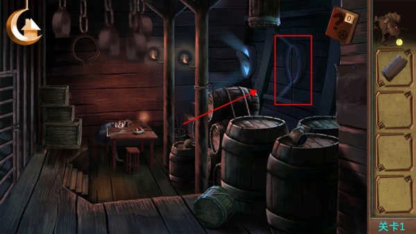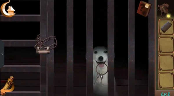 先找到那个骷髅形状的物品,点击后会获得一把小刀;接着去点那个装水的桶,能拿到一个刷子;用小刀把柱子上绑着的绳子割断;然后点击窗户的位置,会找到一根骨头;拿刷子去清理右边墙上纸张上的脏东西,就能看到提示信息;之后点桌子上的盒子,依次输入罗马数字对应的符号,打开盒子得到一个哨子;吹响哨子叫醒狗,再用骨头把狗引过来,就能拿到钥匙,最后用钥匙开门就能出去了。