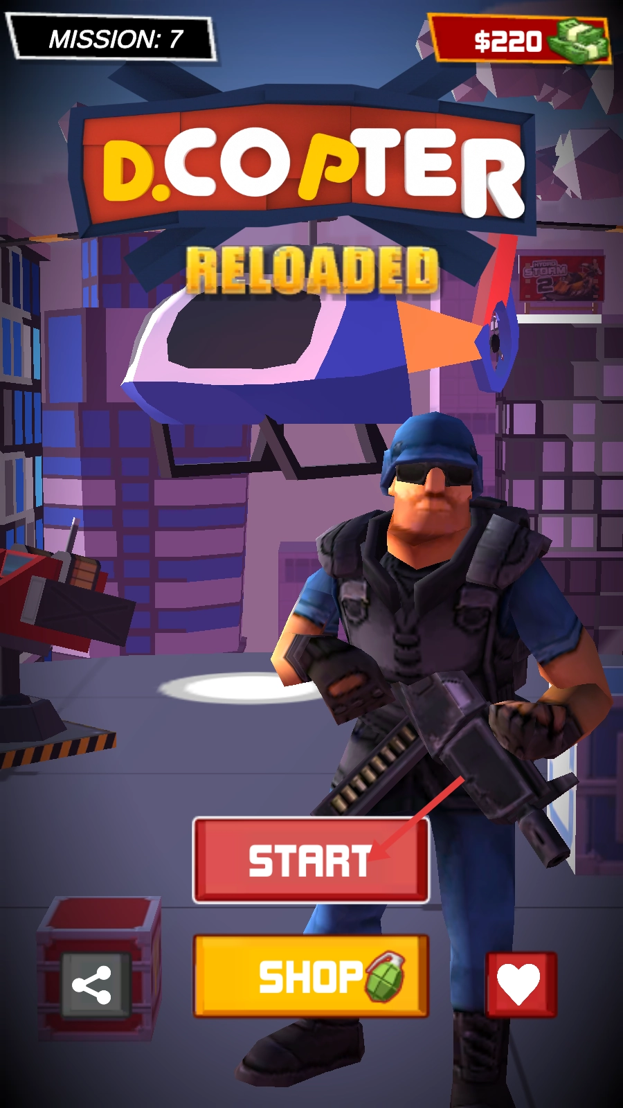 进入《D.COPTERRELOADED》的【MISSION-7】关卡,点击红色的【START】按钮,即可开启该任务的直升机战斗挑战。