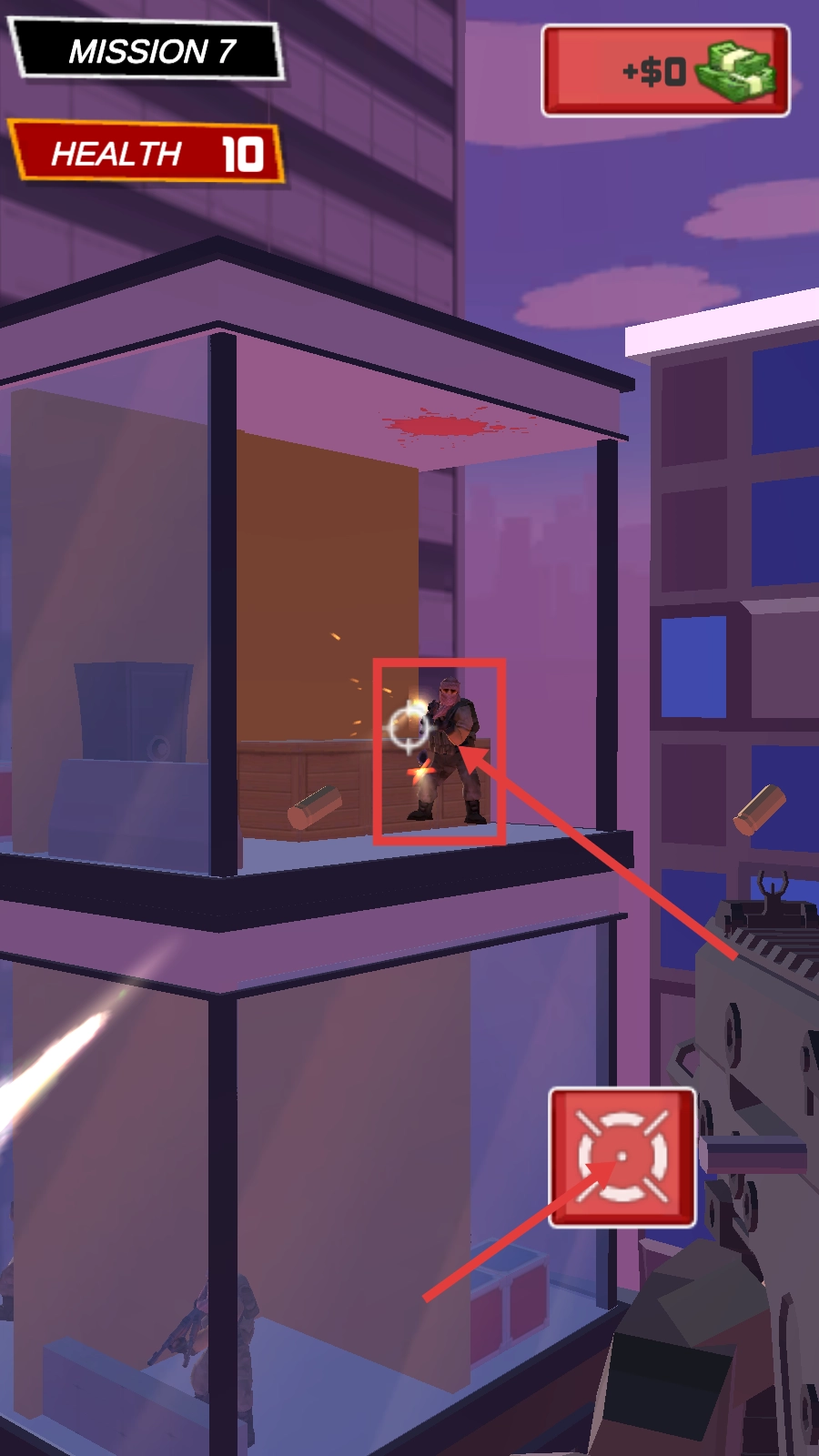 在执行任务7的战斗环节时,需要瞄准建筑物上的敌人,点击射击按钮来发动攻击。与此同时,要密切关注左上角显示的【HEALTH-10】生命值状态,注意躲避敌人的攻击,防止生命值下降。
