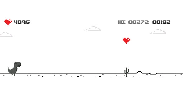 坚持玩的时间越久,小恐龙的跑步速度就会越快。一旦小恐龙撞到障碍物,游戏就会结束。这时你得开启新一轮游戏(分数也会跟着重置),只要按一下空格键,就能重新开始游戏啦。