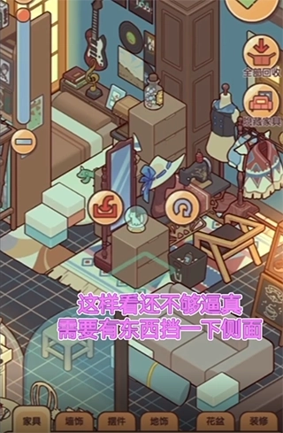 这个游戏的一大特色在于,不同风格套间里的物件能够自由组合搭配,甚至还支持同类型物件的叠加摆放。相比其他一些小游戏那种纯粹手动贴纸般的操作,它少了几分束缚感。我平时玩的游戏不算多,不太清楚有没有玩法类似的作品,但这款游戏的空间布置体验确实很棒,以上帝视角摆放各种物件时,很容易就沉浸其中了。