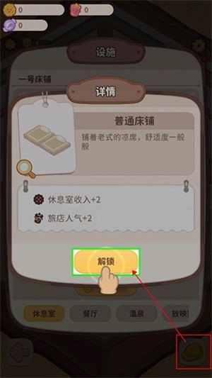 进入客房后,点击右下角的安全帽图标,打开设施页面。选择普通床铺并点击解锁,就能开始布置床铺了,建议尽可能多解锁一些床铺来满足需求。