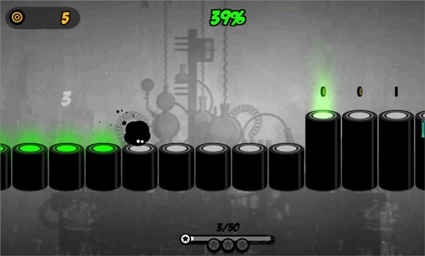 游戏刚开始时会引导玩家完成五次完美着陆的任务。这里的关键是要留意背景音乐里的鼓点,同时观察小墨球下落的轨迹。只有当小墨球的弹跳节奏和音乐的节奏完全匹配时,才是点击的最好时机。一定要让两者保持同步,不然的话就很难完成任务。