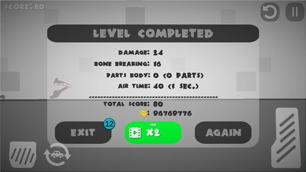 3、驾驶载具撞击火柴人能够获取积分奖励,产生的伤害越大,得到的分数就越多,不过要留意把控车速,防止因为速度过快而引发失控翻车的情况。