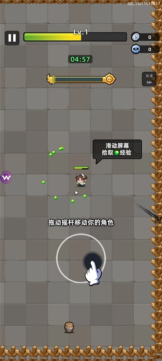 2、战斗中通过拖动摇杆控制角色移动,滑动屏幕拾取经验球,不断升级提升实力。