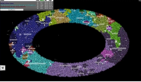 2、正如你所看到的,这个面板背后的星系中遍布着各个国家,每个国家都拥有专属的颜色标识,它们彼此争夺恒星资源,往往处于相互对抗的状态。在左上方区域,能够看到银河系内实力最为强劲的几个帝国的名录。
