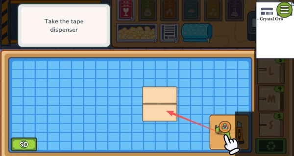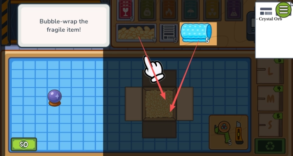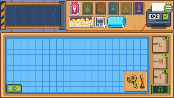 3、点击操作后,左上方会有物品通过传送带输送过来,请挑选合适的物品与箱子,将它们打包妥当。