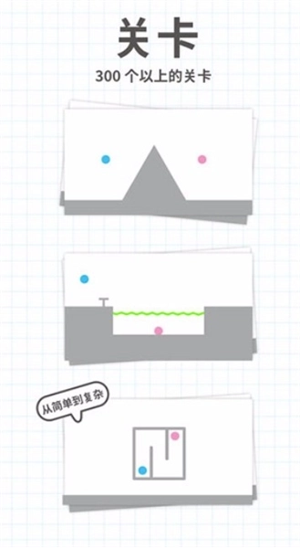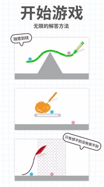 过关的条件其实十分简单,你只需让两个球碰撞在一起就能通关!通过自由划线,让球在指尖自由滚动,让蓝球与红球相撞吧!瞧瞧你的想象力究竟有多丰富。