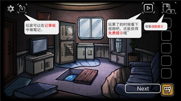 打开洗手台下方的柜子,能拿到一把钥匙和一块方形道具。用这把钥匙打开浴缸旁的柜子,可获得一个盒子以及另一块方形道具(这块道具上有个凸起)。点击旁边的箭头,就能得到提示数字1。