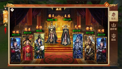 4.国家官员分为:国王、王后、元帅、程序、都督、尚书、巡捕,不同官员有不同的权利和福利。