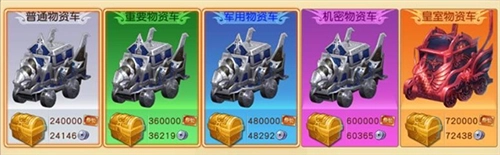 在粮草先行任务里,物资车共分为普通、重要、军用、机密、皇室这5个不同档次;通常来说,物资车的档次越高,玩家完成该任务后能获取的经验值也就越多。
