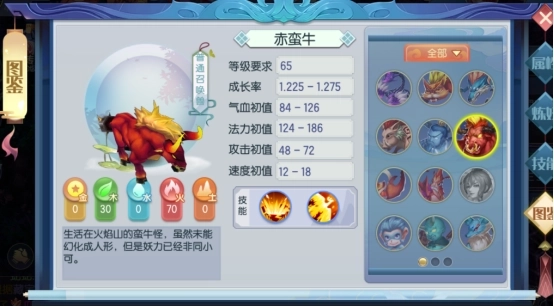 PS:1.赤蛮牛是普通召唤兽,天生就拥有法术群攻和法术单攻技能。和山神相比,它的速度会慢一些,但攻击和气血有显著提升。建议玩家在65级时去捕捉一只,它确实是非常值得推荐的召唤兽之一。