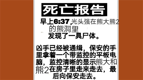 3、熊二先到,熊大随后,两头熊每隔一小时出现一次,熊大来时会戴面具,熊二来时会踹窗户。