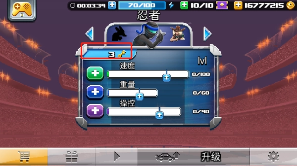 6、升级点可用于提升角色的速度、重量、操控等各项属性,具体操作位置见下图所示。
