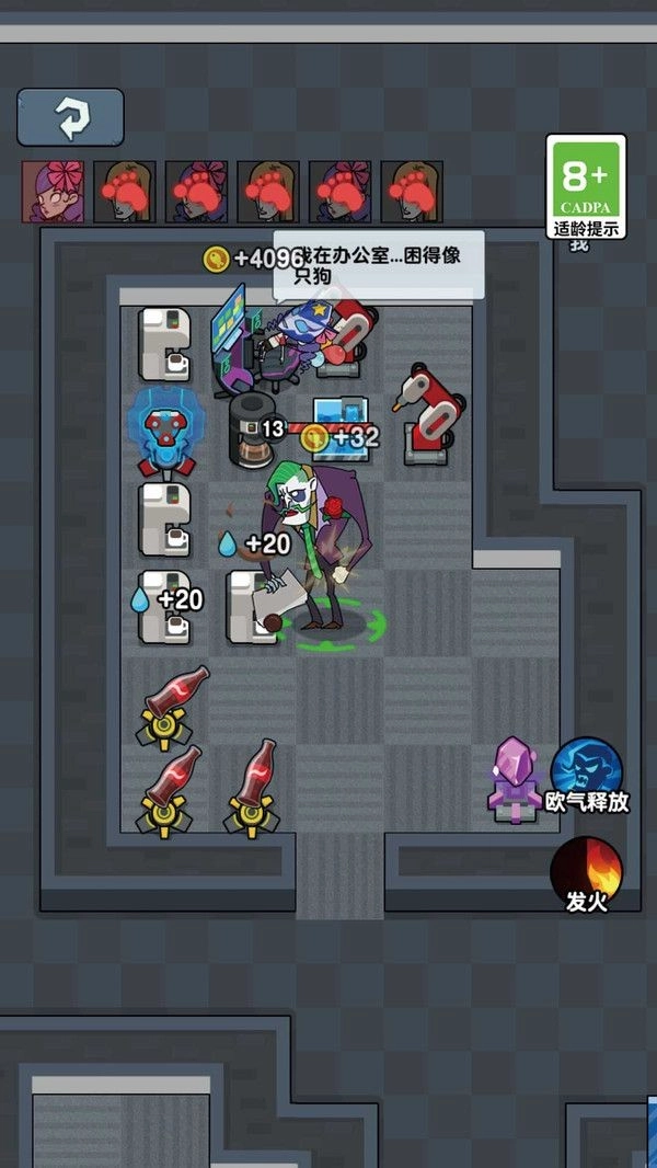 1、化身为打工人,直面代表职场压力的BOSS敌人,巧妙施展专属技能来防御攻击,感受沉浸式的对抗体验。