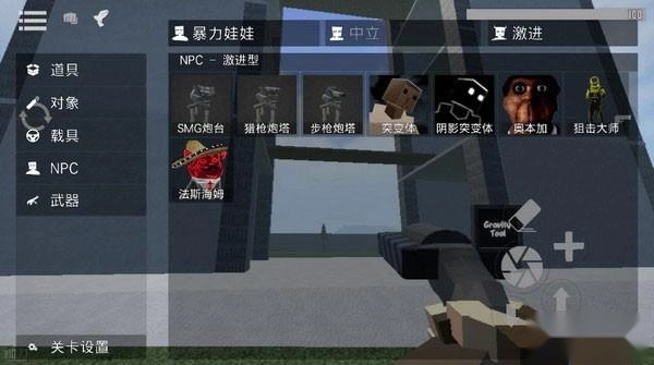 4、点击右侧的“手枪”按钮即可获取枪支,能使角色切换至持枪状态,通过中心位置可进行开枪操作,“+”号按钮则能够添加新的靶子角色。